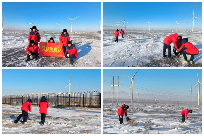 同一時間,公司第三黨支部也在達阪城風電場區域開展(zhǎn)誌願勞動活動。大(dà)家在完成機組運維工作的間隙,主動(dòng)拿起(qǐ)工具,清理場站周邊道路及公共區域的垃圾。大家不畏嚴寒,以高度的責任感和團隊協作精神,迅速投入到垃圾(jī)清撿工(gōng)作中,對角落及(jí)設備周邊的垃圾進(jìn)行細致清理(lǐ),確保每一處通道都安全暢通,每一台設備都(dōu)能正常運行。忙碌的身影在場站中穿梭,與遠處旋轉的風機遙相呼應,共同(tóng)構成了一幅冬日裏充滿溫情與力量的畫卷(juàn)。