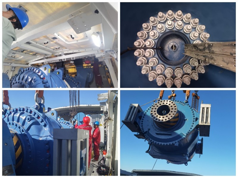5月正值春季大風頻發,這給E2機組齒輪箱(xiāng)恢複工作帶來巨大挑戰。麵對嚴峻形勢,風電場積極應對,不斷優化工作方案,精(jīng)心調整(zhěng)吊裝策略,並成立專項工(gōng)作小組。麵對時間緊、任務重等諸多不利條件,小組人員嚴陣以(yǐ)待、全力以赴投入到更換工作中。吊裝過程中,工作人員緊盯風(fēng)速變化(huà),精準抓(zhuā)住風速6米/秒以(yǐ)下的短暫窗(chuāng)口期,爭分奪秒提前拆卸齒輪箱附件。地麵與機艙作業人(rén)員密切配合,嚴格把控每一個關(guān)鍵環節。從齒輪箱連接(jiē)油管、傳感器、主(zhǔ)軸連接螺(luó)栓,到齒輪箱彈性支撐的(de)安裝(zhuāng)工藝,每一步操作都細致入微、嚴謹規範。經過運維人員12小時的艱苦奮戰,E2齒輪箱吊裝更換工作順(shùn)利完(wán)成。
