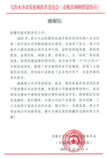 (通訊員 朱鑫鑫/攝影 龔俊屹)12月13日,風能公司收到烏魯木齊市發展和(hé)改(gǎi)革委(wěi)員會(市糧食和物資儲(chǔ)備局)發來的感謝信,信中對風(fēng)能公(gōng)司達阪(bǎn)城升級改造項目在自治區第二批市場化並網(wǎng)新能源項目(mù)中保質保量保時(shí)完成並網,為首府經濟、就(jiù)業、綠色(sè)發展(zhǎn)及拉動固定資產投資增長作(zuò)出(chū)的貢獻表示高度肯定和感謝。
