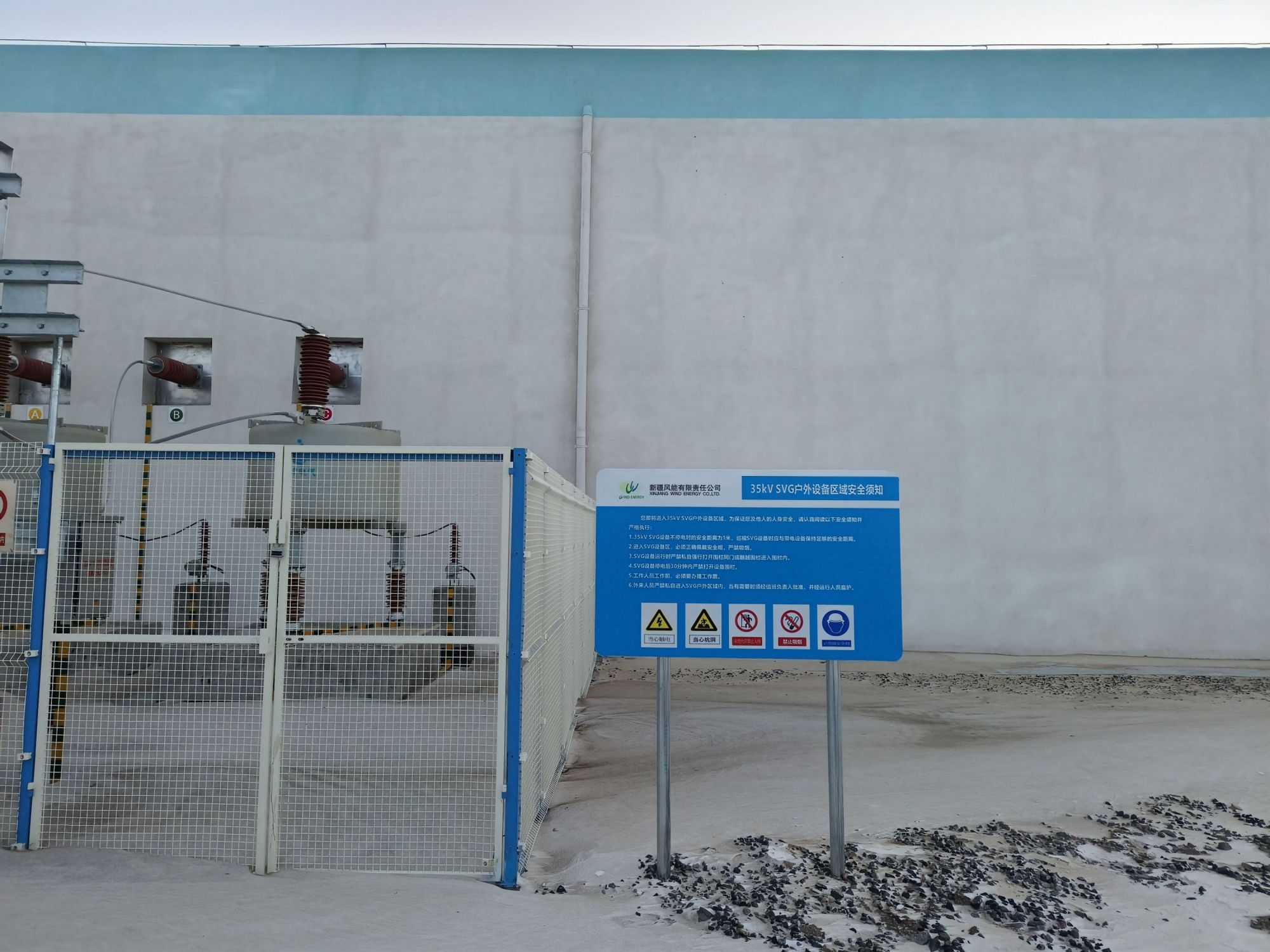 安裝開始前,場站提前對(duì)運維人員進行(háng)安全技術交底,開具(jù)工作票。安裝中,工作班成員默(mò)契(qì)配合,分組分區域負責,做好全過程安全監督,穩步推進安裝工作。經過兩天緊張有序地(dì)安裝,共完成警告類、禁止類(lèi)、提示類標(biāo)識牌200餘塊,涉及天樞110kV變電站內35kV高(gāo)壓室、10kV高壓室、35kV SVG室、110kV GIS室、主(zhǔ)變區域、儲能區域等多個場所。