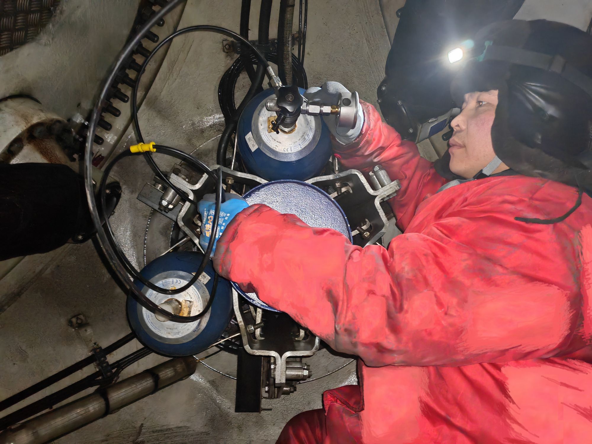 圖3檢修人員在輪(lún)轂中對變槳蓄能器進行檢測並充裝(zhuāng)氮(dàn)氣